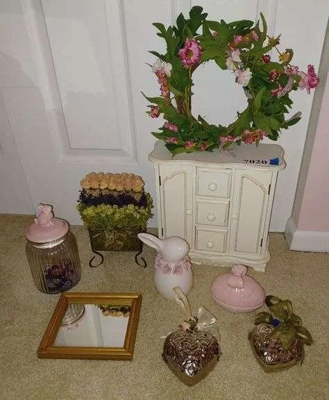 7020 White jewelry box, mirror, potpourri holders, bunnies, Etc