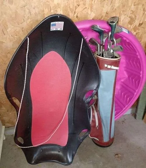 7175 Plastic kiddie pool, sled, vintage golf clubs in bag