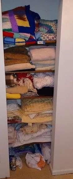 7023 Contents of linen closet including blankets, Afghans, sheets and bed linens, towels, Etc