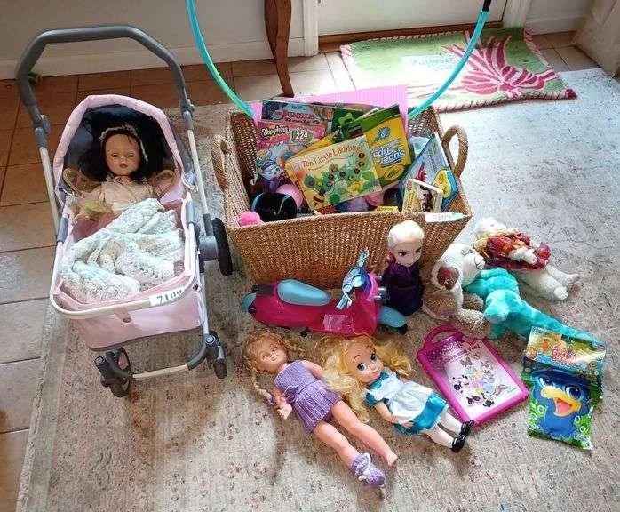 7109 Toys including dolls, doll buggy, Illuminating hula hoop, children's books, crayons, markers, Etc