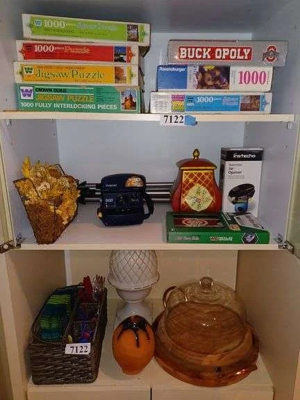 7122 Puzzles, games, serving pieces, vase, Polaroid camera, Etc