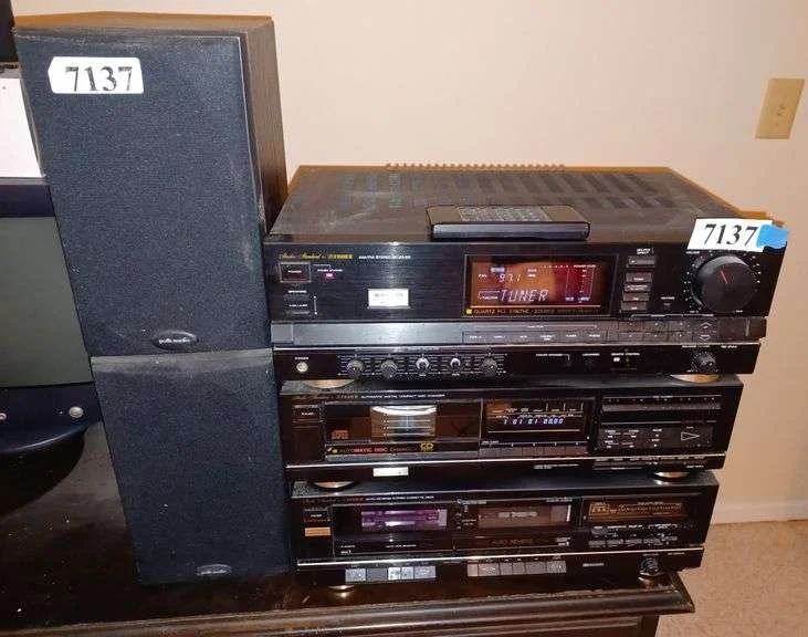 7137 Fisher component stereo system, pair of Polk Audio speakers.