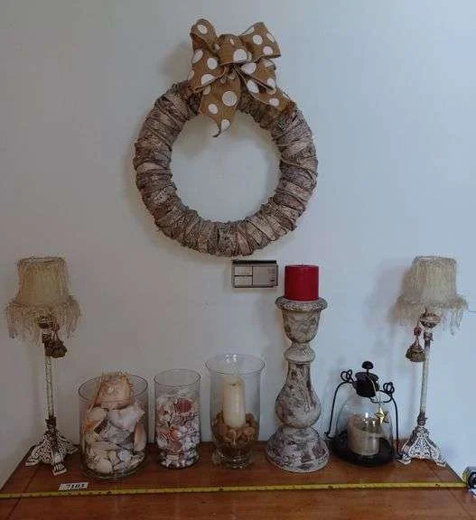 7103 Pair of lamps, seashells, candle holders and candle lamp, bark wreath