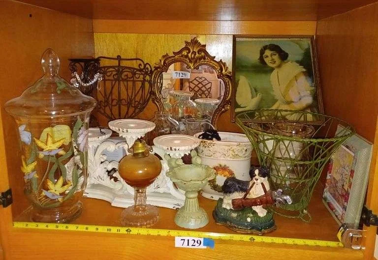 7129 Oil lamp, vases, candle holders, mirror, framed print, reproduction cast iron doorstop, Etc