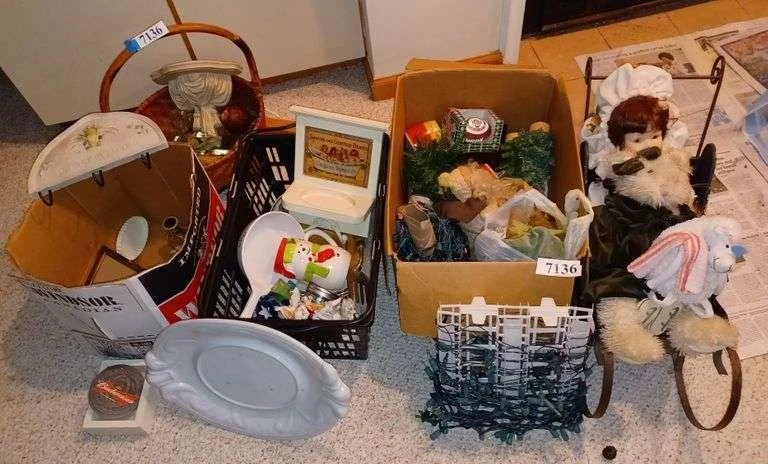 7136 Christmas decor, wall hangings, glassware, doll and bear in sleigh, etc.