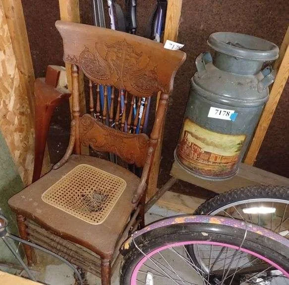 7178 Antique pressed back Oak chair with bad cane seat, milk can