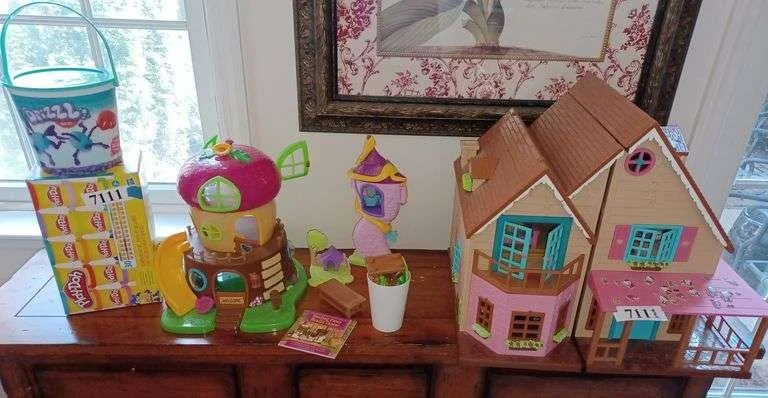 7111 Toys including playhouse sets, doll, mostly full box of play-doh, Etc