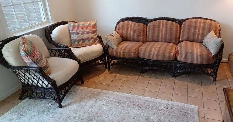 7104 Plastic "wicker" sofa and two armchairs with cushions and accent pillows