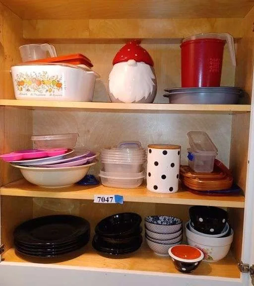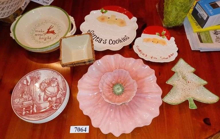 7047 Dishes, Corning bakeware, Santa cookie jar, plastic food containers, serving pieces, travel mugs, etc.