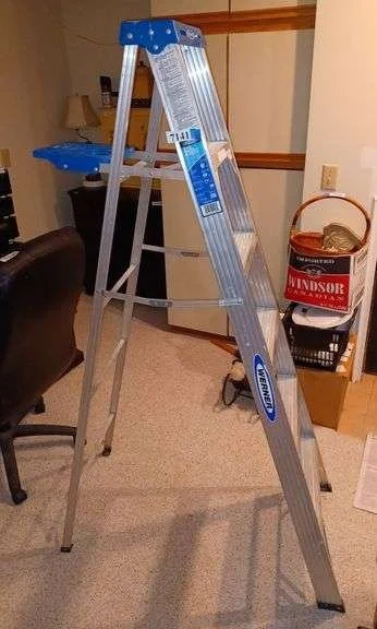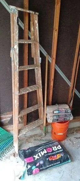 7155 Six foot wooden step ladder, rake, firewood, mostly full bag of potting soil