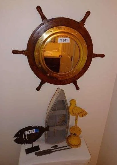 7147 Ship's wheel mirror, decorative rowboat, fish,