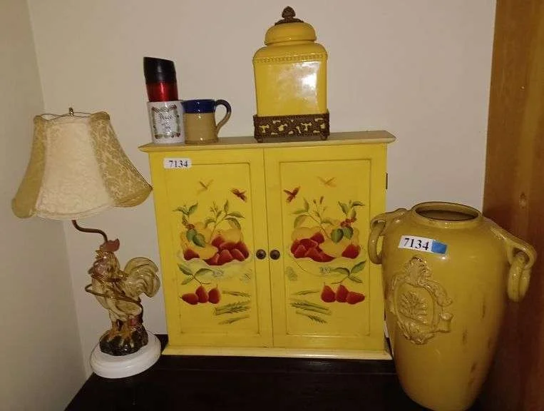 7134 Cabinet, rooster lamp, vase, covered dish, Etc
