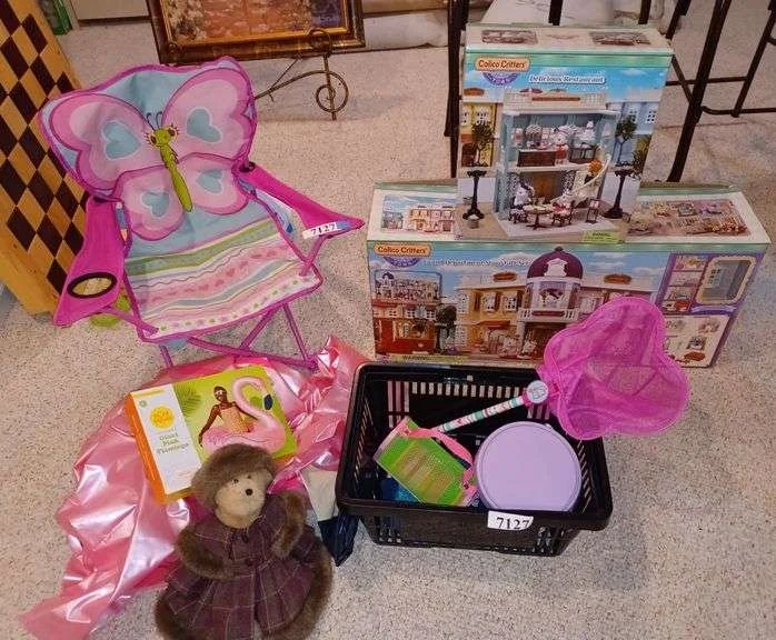 7127 Calico Critters playsets, folding chair, Razor scooter, giant inflatable pink flamingo, Etc