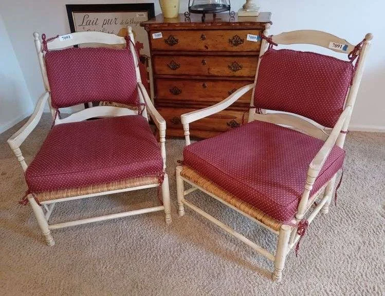 7091 Pair of white rush seat ladder-back chairs with red cushions