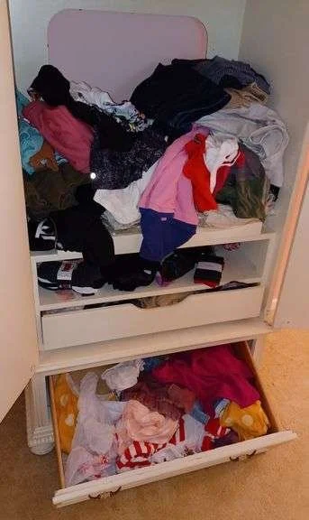 7008 Clothing in TV cabinet including jeans, shorts, t-shirts, new socks, Etc