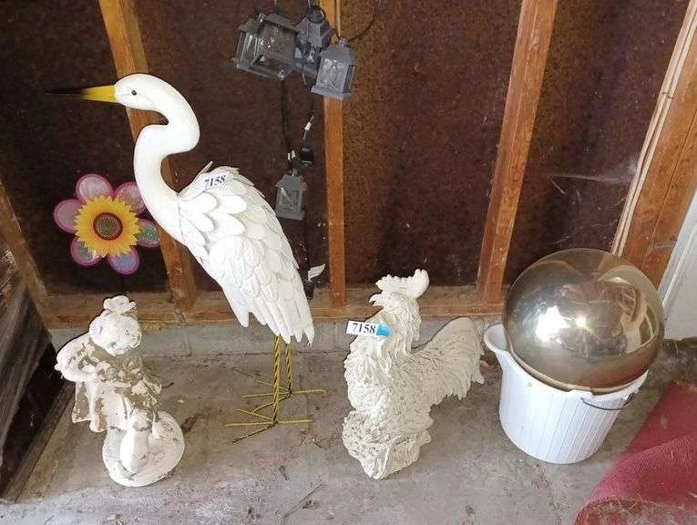 7158 Metal stork, plastic rooster and girl figurines, gazing ball, pinwheel