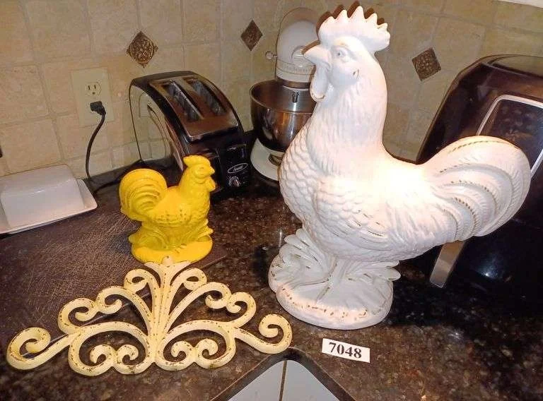 7048 Roosters, biscotti jar, metal and ceramic decorative bowls, Etc