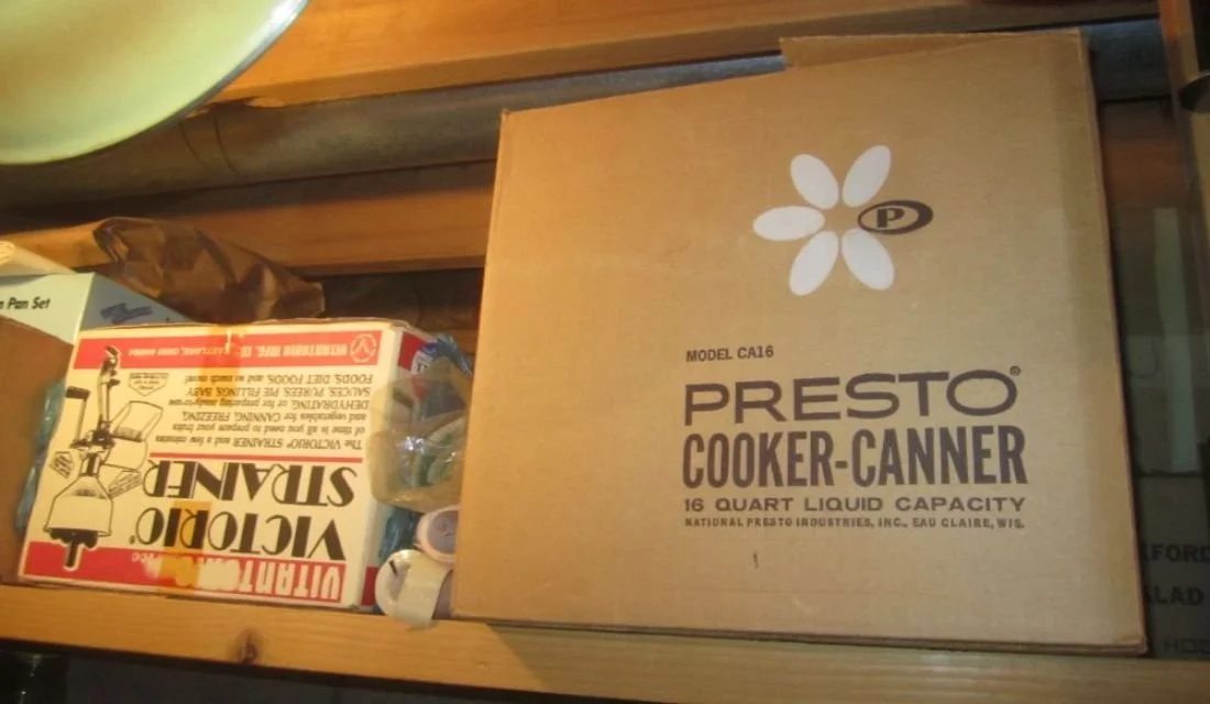 Household goods including dorm-sized refrigerator; Dehumidifier; Air purifiers; Small kitchen appliances; Pots & pans; Kitchen utensils; Everyday dishes, glasses, silverware, etc; Propane grill; TV; Stereo receivers; DVD player; CDs; Folding stools; Holiday décor; Sheets, towels etc.; Vacuums; Brother sewing machine in cabinet; Canning jars and canning supplies; Cooler;
