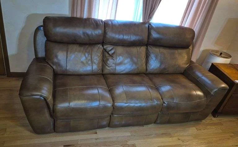 6006 Haining Highpoint Furn. brown leather ? sofa with power recliner ends, power adjustable headrest, Lu