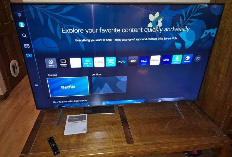 6011 Samsung 55 inch Smart TV with remote, manual, and antenna