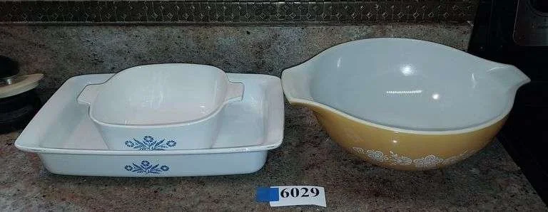 6029 Pyrex Butterfly Gold pattern bowl, CorningWare Blue Cornflower baking dishes