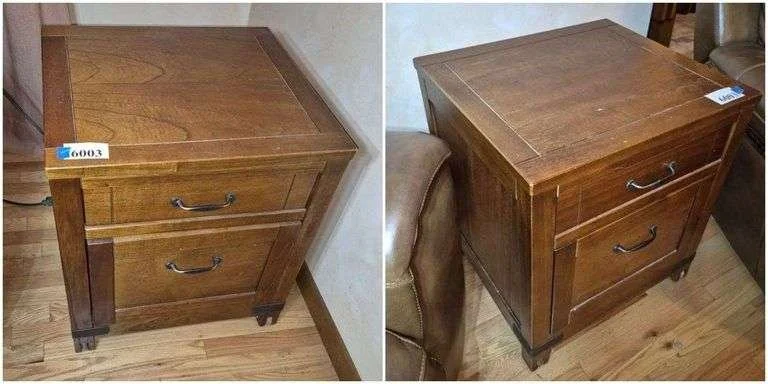 6003 Pair of Arhaus end tables / nightstands on wood rollers.