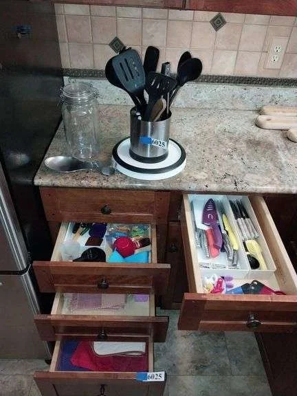 6025 Contents: knives, measuring spoons, measuring cups, kitchen utensils, kitchen towels, other utensils