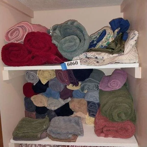 6060 Bath, hand, and washcloth towels, shower curtain, tablecloth, apron