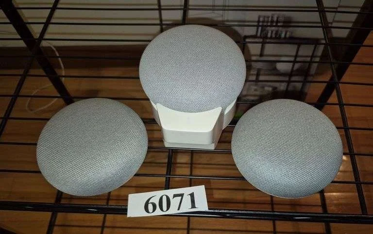 6071 Three Google mini smart speakers, one with plug-in adapter / charger.