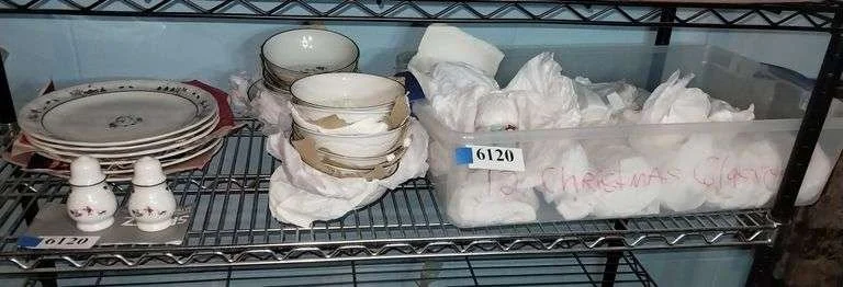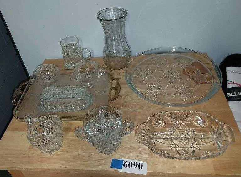 6090 Pattern and cut glass creams and sugars, butter dish, divided dish, mug, platter, vase, gold trimmed