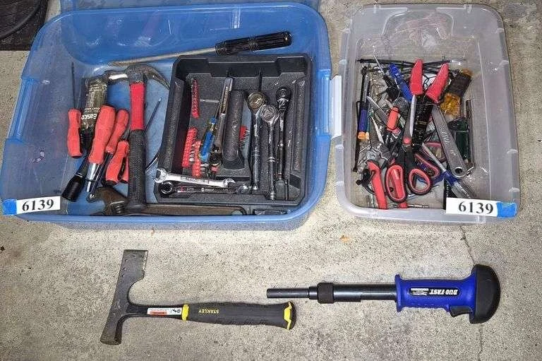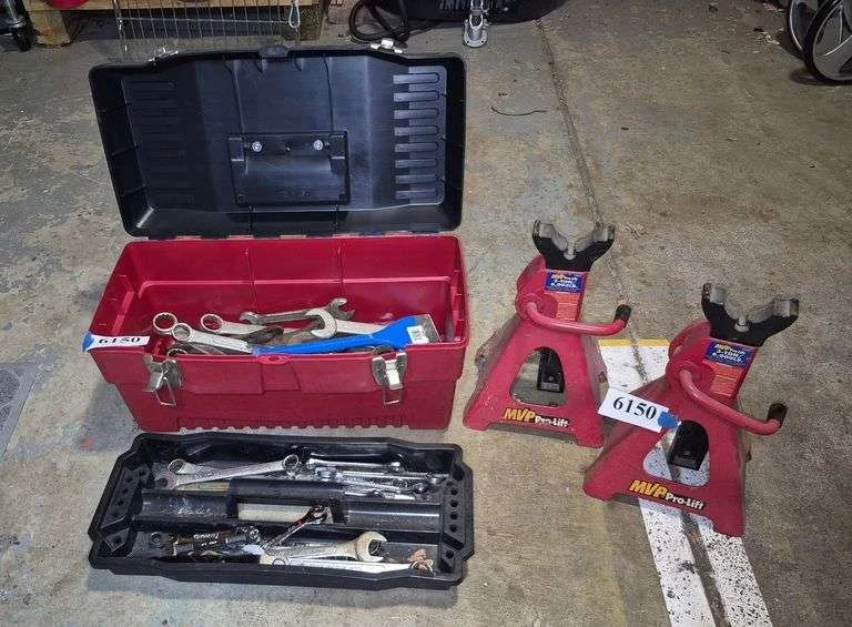 6150 Pair of 3 ton jack stands, plastic toolbox with tray, wrenches, Etc