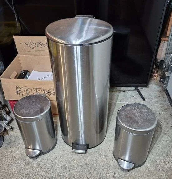 6020 Pair of simple human stainless steel trash bins labeled trash and recycle