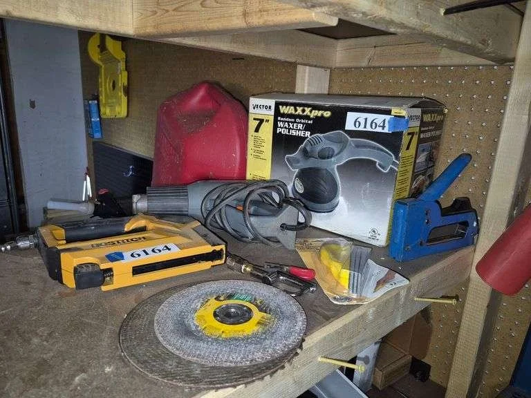 6164 7-in waxer/polisher, Bostitch air stapler, staple gun, heat gun, saw blades, Etc