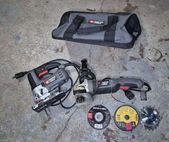 6166 Porter Cable jigsaw and angle grinder with blades in bag