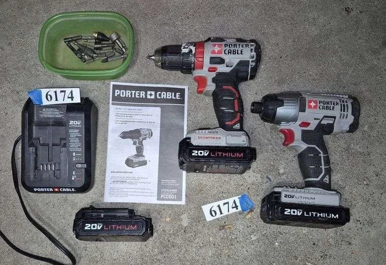 6174 Porter-Cable 20 volt lithium drill driver, impact driver, three batteries, charger, and accessories