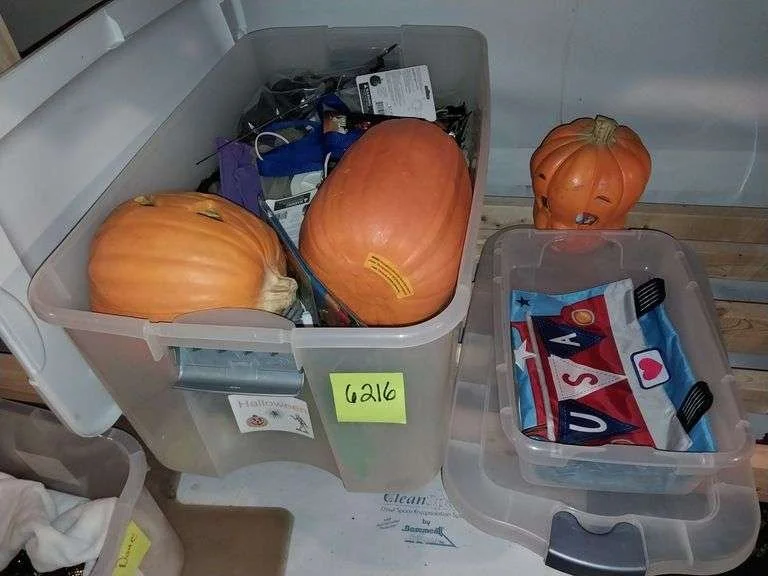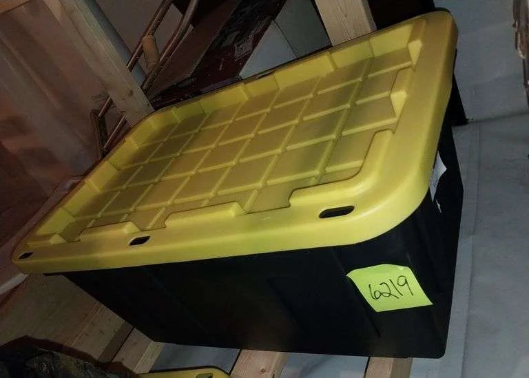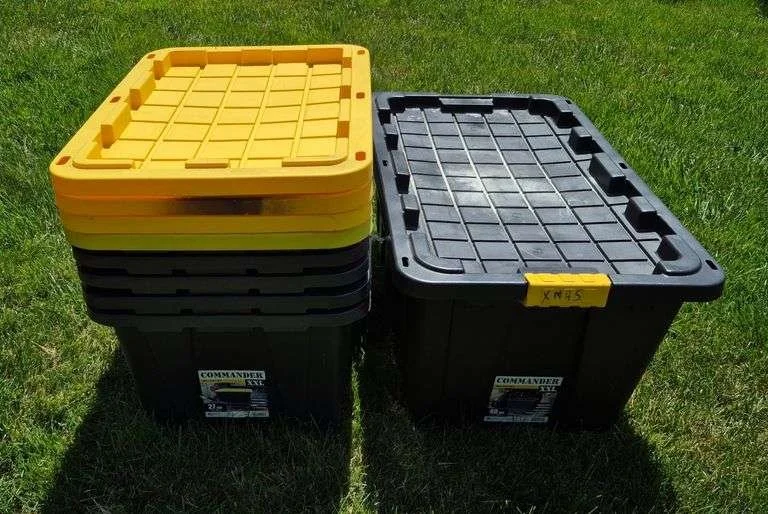 6184 Large empty storage totes including one 40 gallon tote with lid, five 27 gallon totes with lids