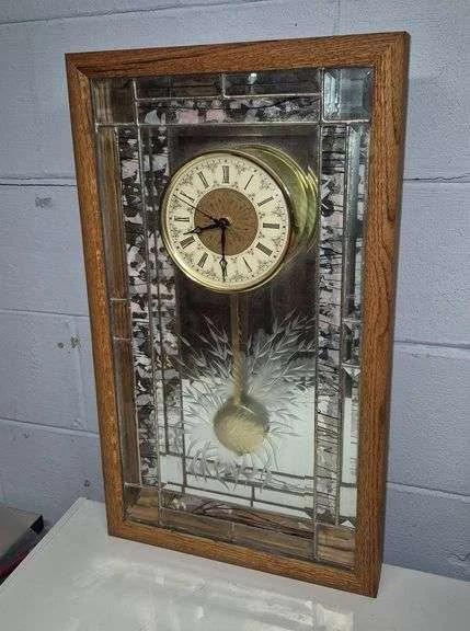 6192 Oak frame etched and leaded glass battery operated wall clock