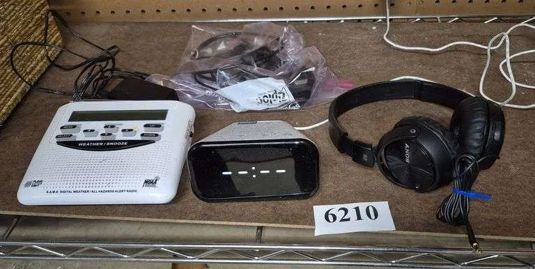 6210 Lenovo smart speaker/clock, weather radio, Sony headphones, Etc