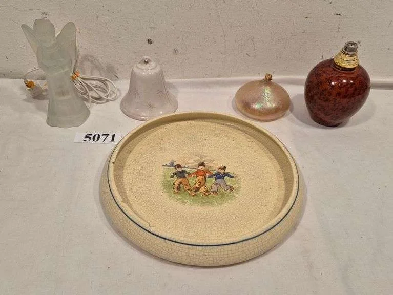 5071 Roseville Pottery childs plate/tray, oil lamps, bell, frosted glass angel lamp