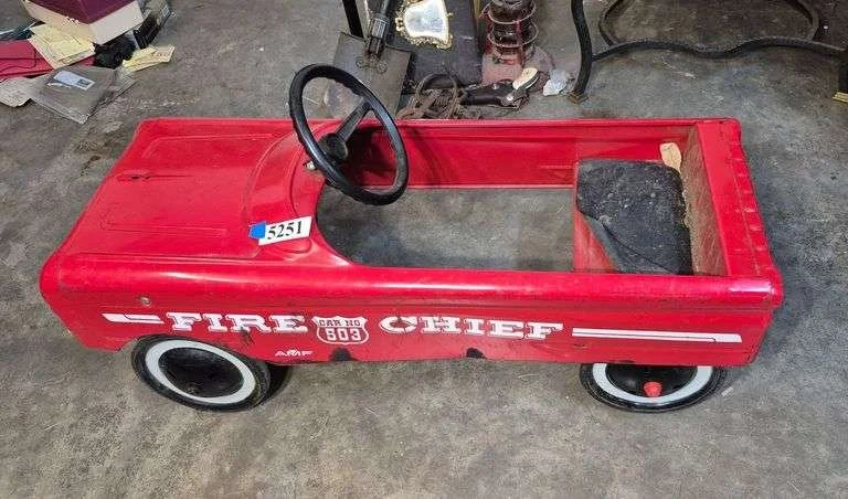 5060 Vintage Marx toys key wind tractor, Fire Department chief pull cord toy, ERTL manure spreader wagon,