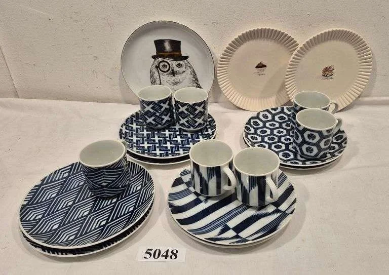 5053 Russell Wright cups, saucers, and stacked cream/sugar, Raymor by Roseville plate, ceramic mold, Baue