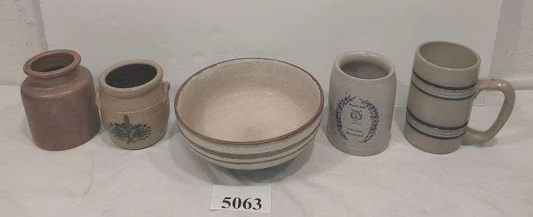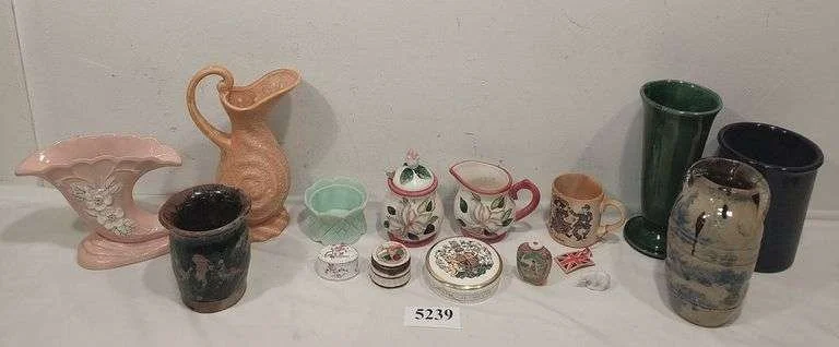 5024 Ceramic and pottery planters, mugs, bowls, eggplant covered dish, pitcher, etc