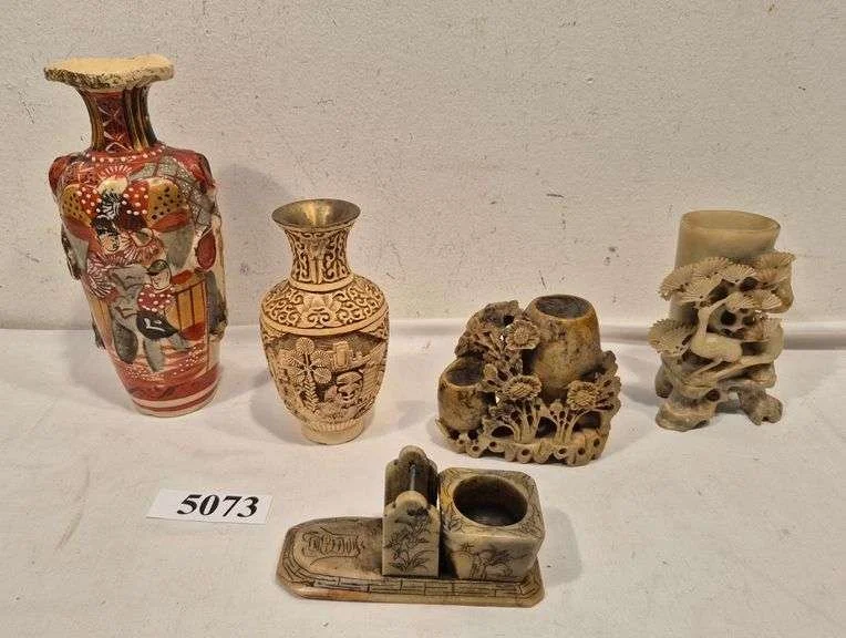5073 Ceramic vase, faux Ivory carved vase, two carved soapstone vases, carved soapstone ink well