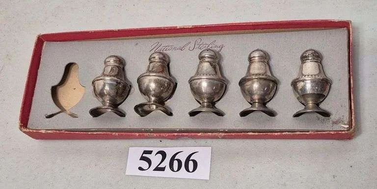 5008 Sterling weighted salt and pepper, silver plate plates, serving platters and bowls, butter dish, div