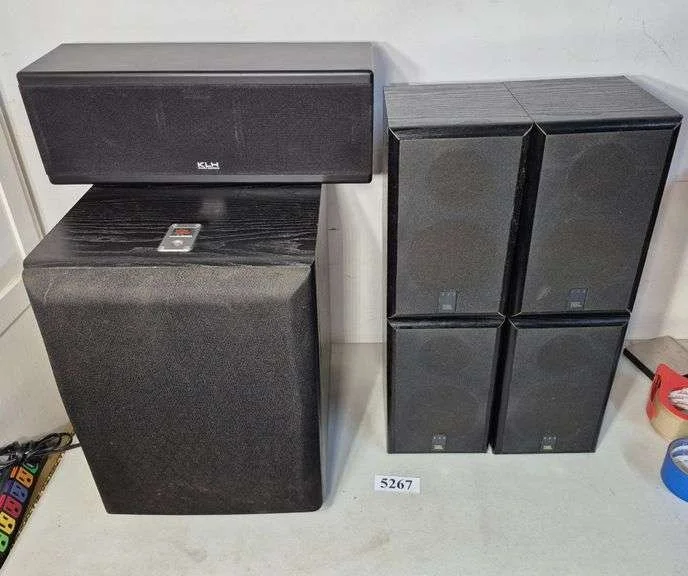 5267 JBL powered subwoofer, four JBL 500 bookshelf speakers, KLH Center Channel speaker