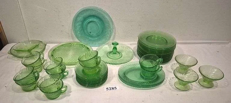 5285 Green depression plates, sandwich plate, cake plate, cups and saucers, divided serving bowl, sherbet