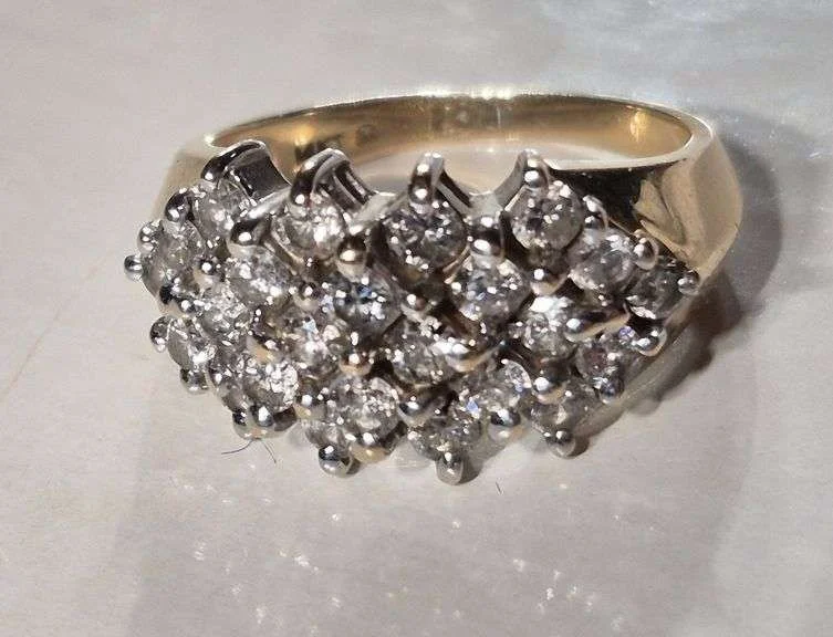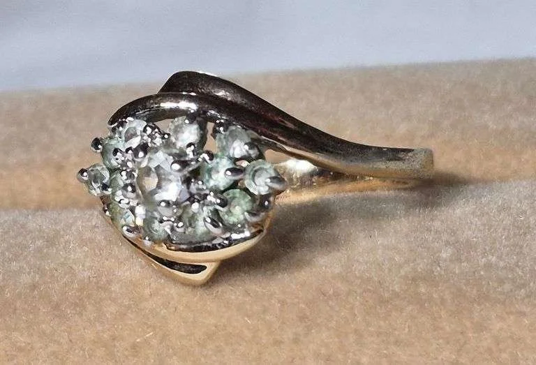9659 Sterling ring with large faux diamond, Sterling leaf pin, Sterling silver and gemstone cross