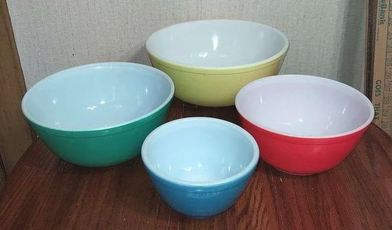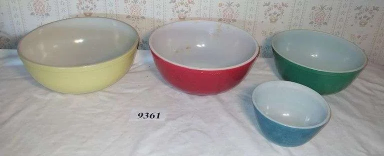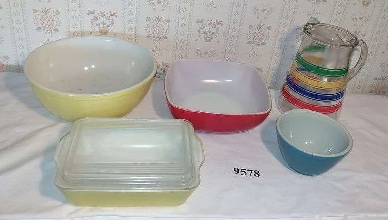 9578 Vintage Pyrex yellow, red and blue bowls, yellow baking dish with lid, glass pitcher