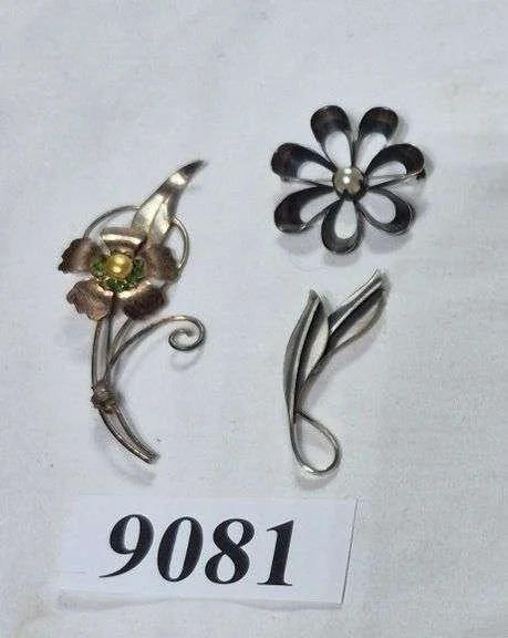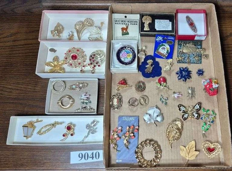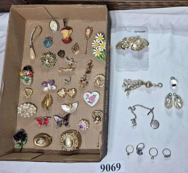 9069 Costume jewelry pins and brooches, rings, barrette, Etc