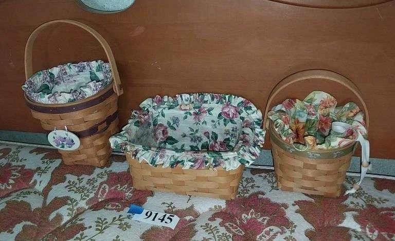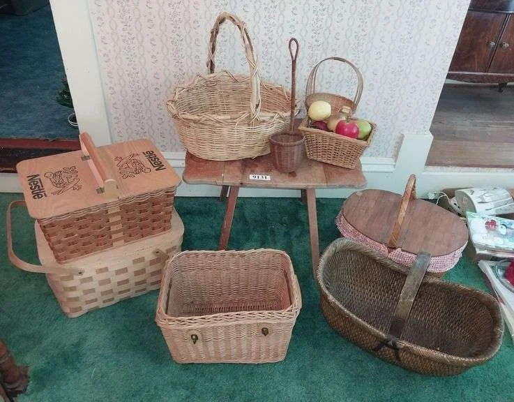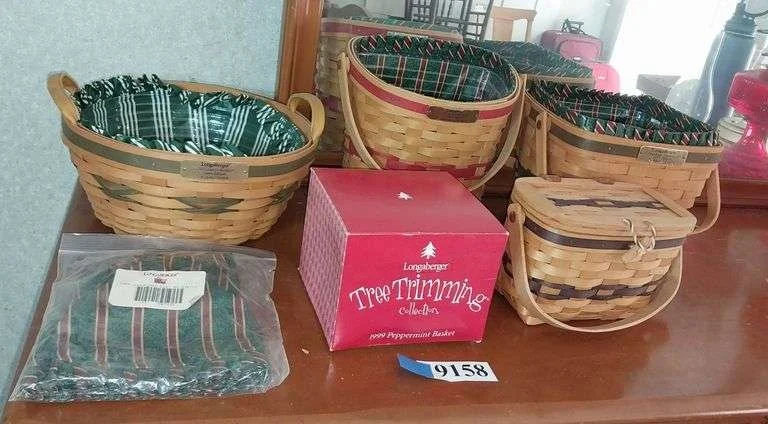 9626 Baskets, Tupperware, doilies, Longaberger candy corn crock, etc.